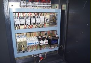 3. Elektrická skříň na levé straně. Ovládací tlačítka jsou umístěna na tlačítkovém stole stroje. Elektrický spínač, kontrolky jsou v elektrickém pouzdře.